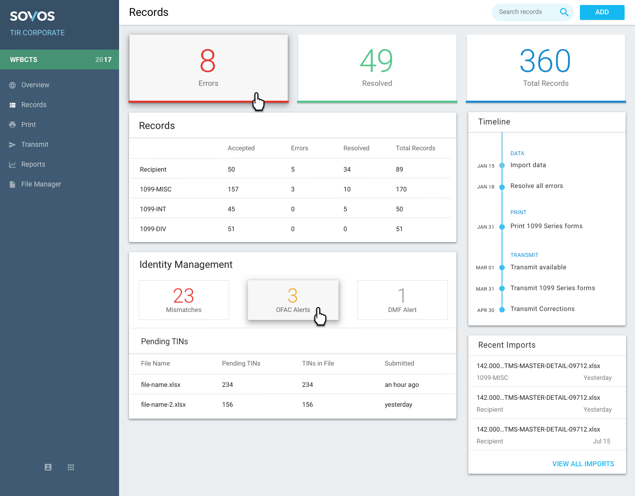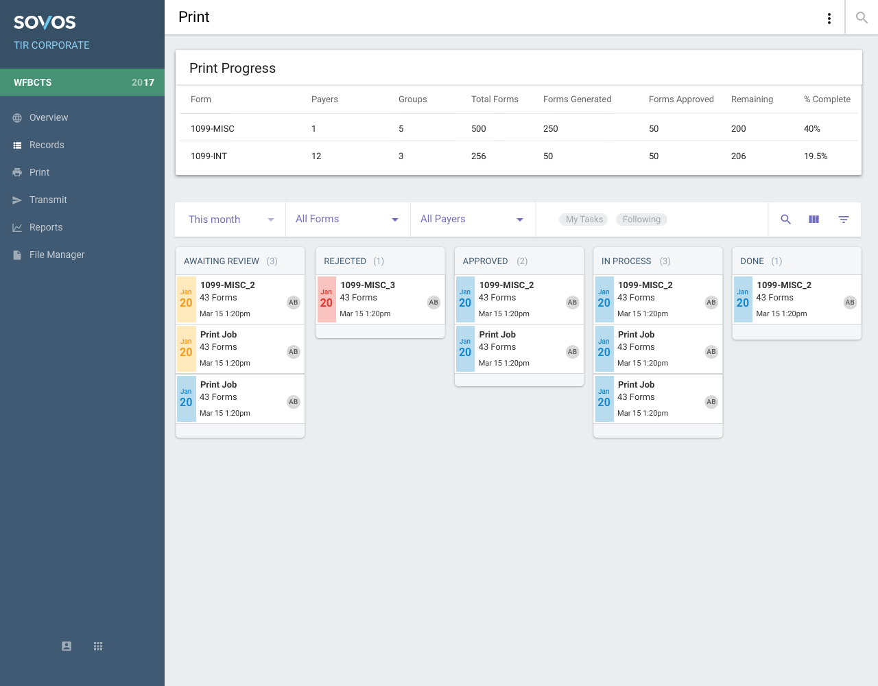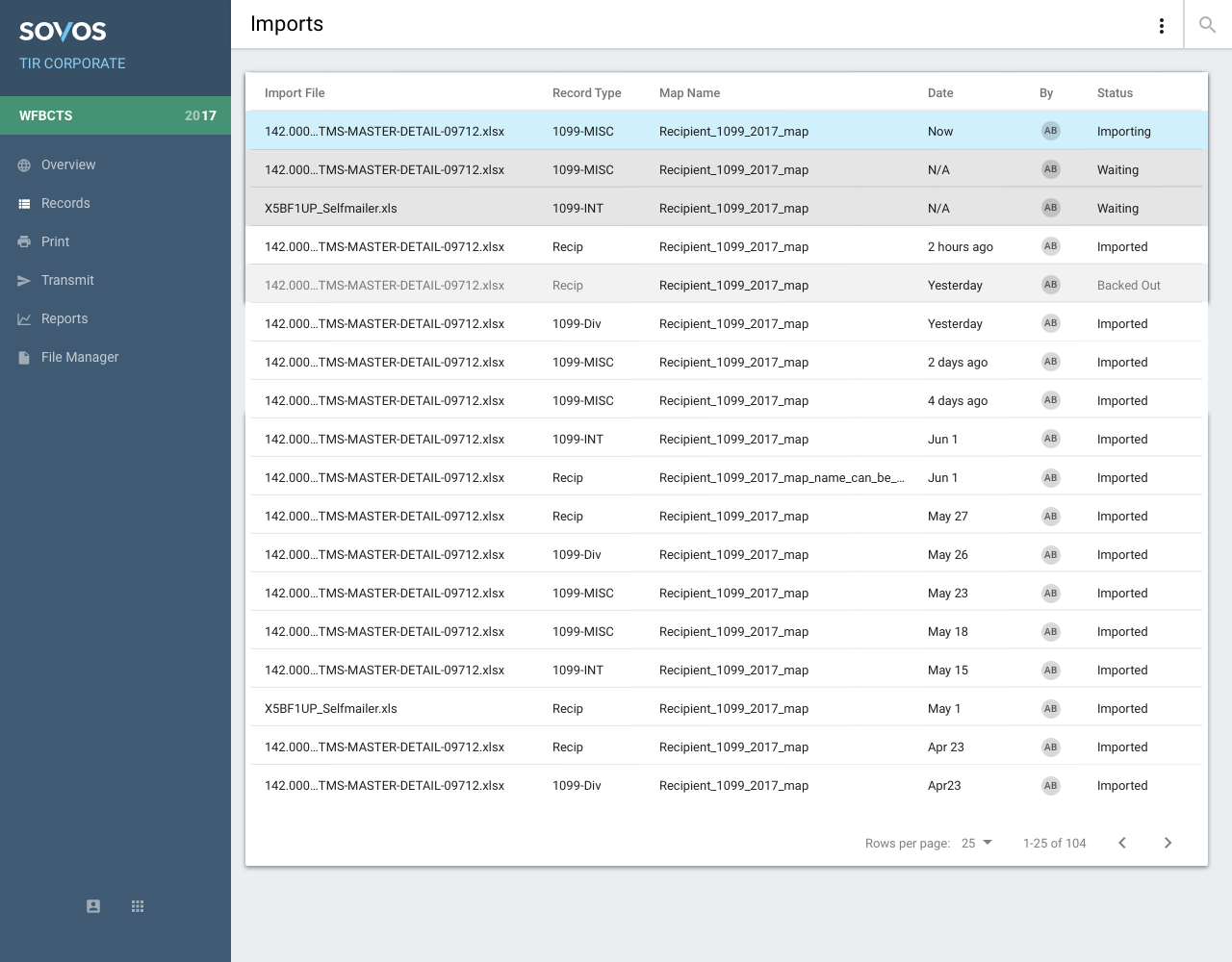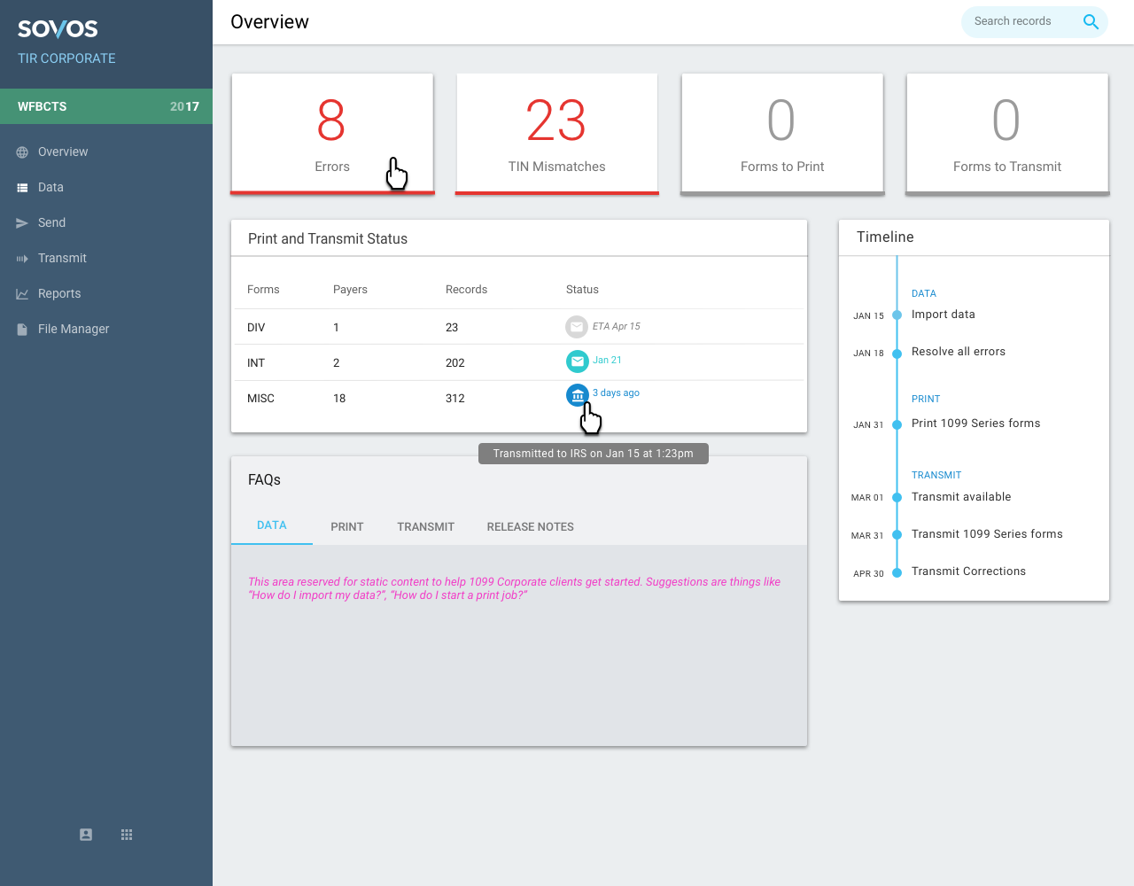 Sovos TIR Manager is a product created for IRS 1099 reporting and compliance. Using this product, customers are able to import their recipient and form data (which can include millions of records), validate the information with the IRS and complex validation rules inside the application, and then print and transmit the 1099 forms, all within a narrow timeframe. The existing application is more than 15 years old and built using Delphi. The new product is built as cloud-based application with modern design and development practices.